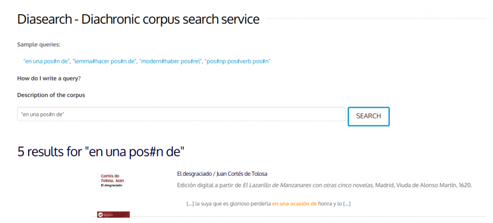 [cs_content][cs_section parallax=”false” separator_top_type=”none” separator_top_height=”50px” separator_top_angle_point=”50″ separator_bottom_type=”none” separator_bottom_height=”50px” separator_bottom_angle_point=”50″ style=”margin: 0px;padding: 45px 0px;”][cs_row inner_container=”true” marginless_columns=”false” style=”margin: 0px auto;padding: 0px;”][cs_column fade=”false” fade_animation=”in” fade_animation_offset=”45px” fade_duration=”750″ type=”1/1″ style=”padding: 0px;”][cs_text]Last May, 29th, Gustavo Candela and M. Pilar Escobar, from Fundación Biblioteca Virtual Miguel de Cervantes presented the Diachronic Corpus Search Service, Diasearch, an online service which enables users to perform linguistically enriched queries on a collection of historical texts. It is currently available for the Spanish IMPACT-es corpus and can be used at https://www.digitisation.eu/tools-resources/language-resources/diachronic-corpus/.