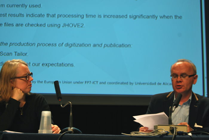 Dr. Rafal Lewandowski, from Wielkopolska Biblioteka Cyfrowa, showed their results with ImageMagick, Scan Tailor and JHOVE.